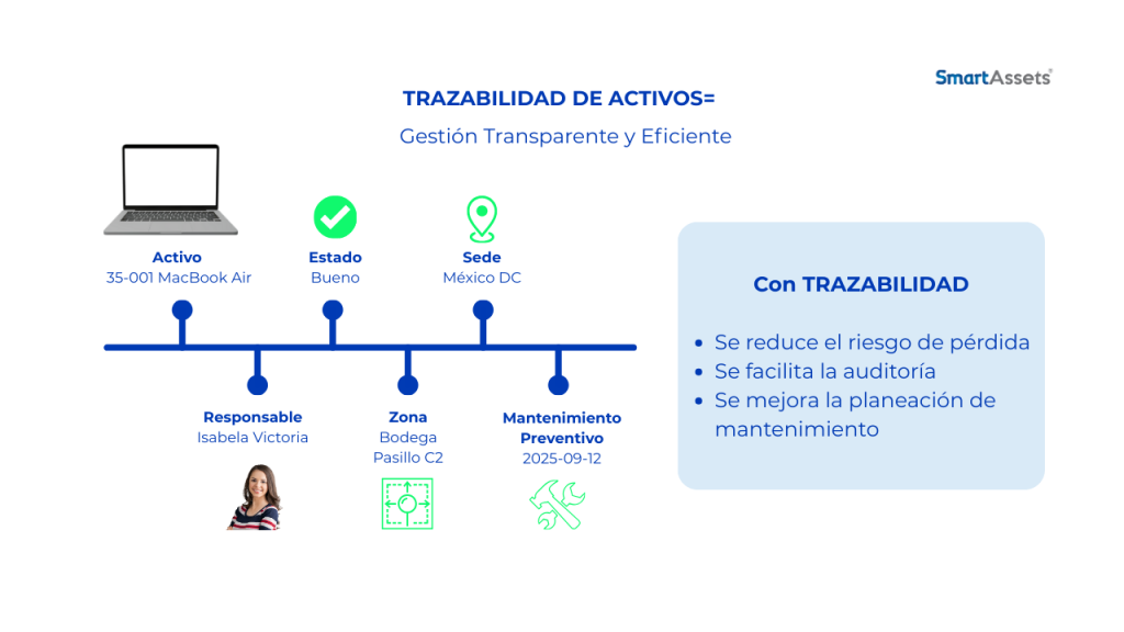 La trazabilidad consiste en poder rastrear de manera continua y detallada la historia, ubicación, estado y responsable de cada activo dentro de la organización.